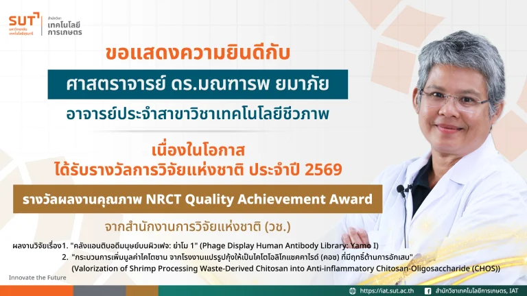 รางวัลและความภาคภูมิใจ สำนักวิชาเทคโนโลยีการเกษตร มหาวิทยาลัยเทคโนโลยีสุรนารี ขอแสดงความยินดีกับ ศ. ดร.มณฑารพ ยมาภัย เนื่องในโอกาสได้รับรางวัลการวิจัยแห่งชาติ : รางวัลผลงานคุณภาพ NRCT Quality Achievement Award ประจำปี 2569 จากสำนักงานการวิจัยแห่งชาติ (วช.)December 9, 2025December 9, 2025